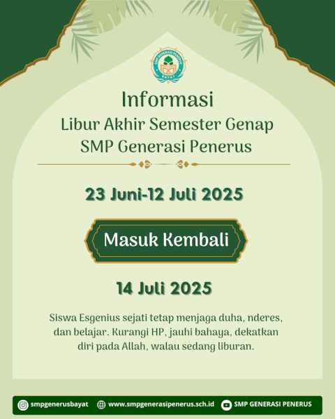 Yeayy libur telah tiba!!! Setelah menjalani serangkaian kegiatan Asesmen Sumatif Akhir Semester dan pengambilan raport, tibalah saatnya siswa-siswi SMP Generasi Penerus menyambut libur akhir semester genap yang dimulai dari tanggal 23 Juni - 12 Juli 2025, kemudian masuk sekolah kembali tanggal 14 Juli 2025.