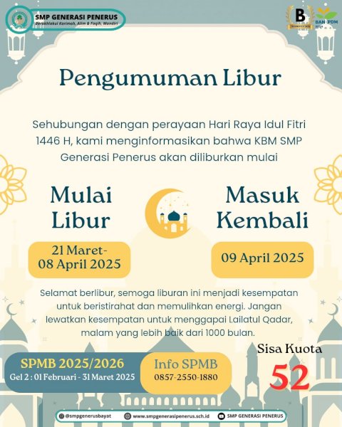 Hari raya Idul fitri 1446 H semakin dekat, maka dari itu kegiatan KBM di SMP Generasi Penerus libur mulai tanggal 21 maret - 08 April 2025, mulai masuk sekolah tanggal 09 April 2025