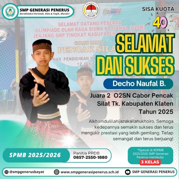 Selamat dan Sukses kepada Decho Naufal B. atas diraihnya Juara 2 Lomba O2SN Cabor Pencak Silat tingkat Kabupaten Klaten.